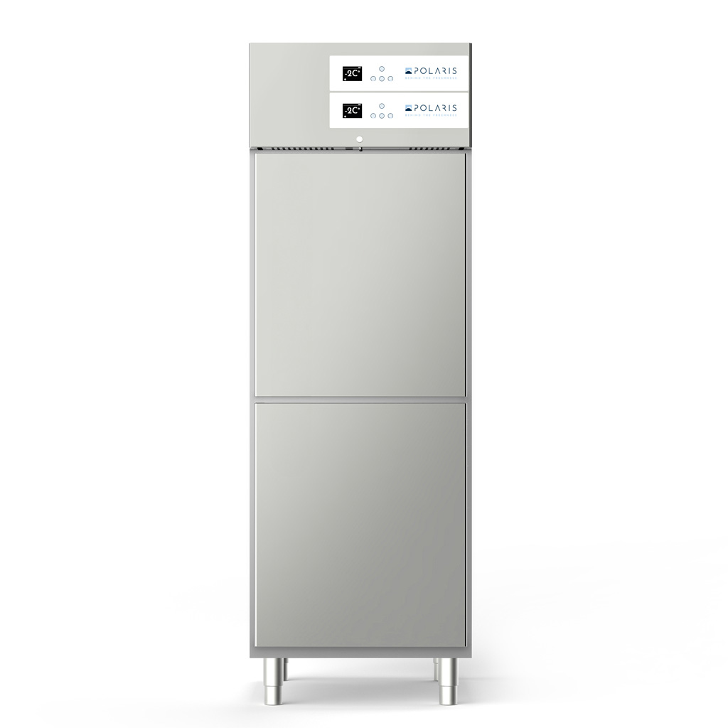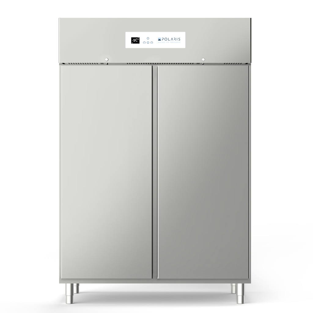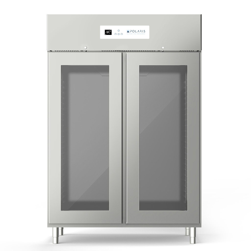 1298 litre capacity, self contained upright refrigerator with two glass doors.